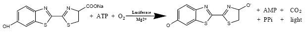D-虫荧光素(D-Luciferin)是萤火虫荧光素酶底物,其量子效率为0.88,是Luminol的20倍。反应原理:首先,在镁离子存在下荧光素酶使荧光素与ATP反应,接着它被氧化形成二氧杂环丁烷结构并发出黄绿色的光。Luciferin-luciferase发光用于ATP监控以测定细胞活力以及细菌计数。它还用于报告基因检测。可与小动物活体成像系统配套使用,用于标记LUC基因后的体内活体荧光检测。